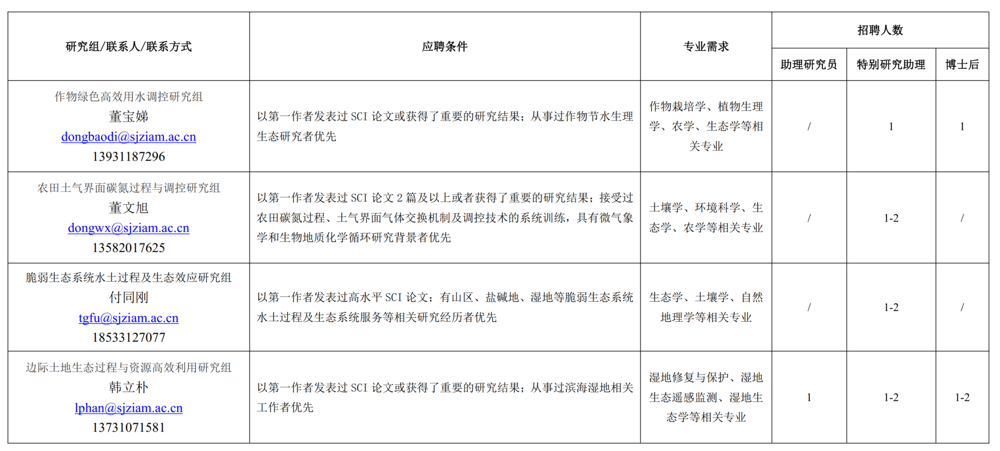 2. 提交方式: 发送电子邮件至附表中的联系人和 zhaopin@sjziam.ac.cn, 邮件主题和文件名为: 招聘岗位联系人姓名-申请岗位类别-申请者姓名。